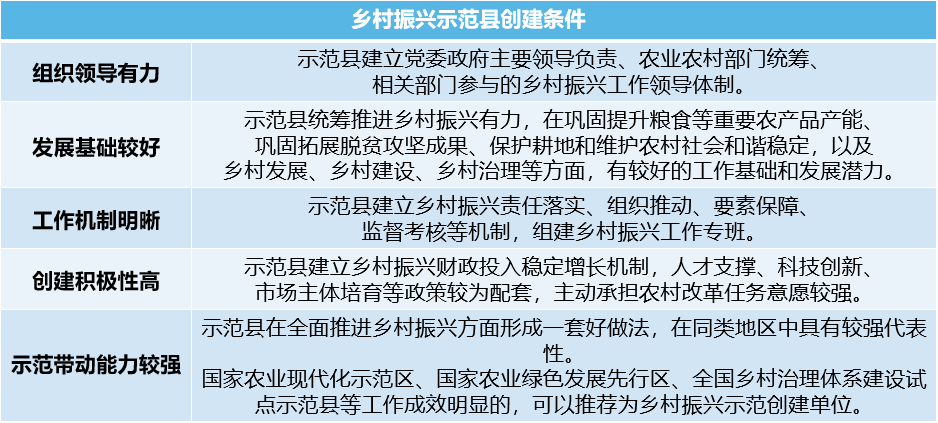 示范縣:重點是培育“一縣一業”主導產業,推進農業生產品種培優、品質提升、品牌打造和標準化生產,引導資金、技術、人才等要素向農業產業園區集聚,健全科技人才服務機制,統籌山水林田湖草沙系統治理,穩步提升農村基礎設施建設水平,不斷改善農村人居環境,逐步實現縣域教育、醫療、養老等基本公共服務便利可及,推廣清單制、積分制等治理方式,持續推進農村移風易俗。